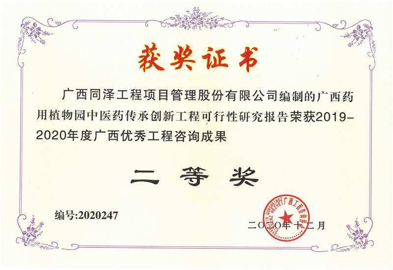 广西药用植物园中医药传承创新工程可行性研究报告荣获2019-2020年度广西优秀工程咨询成果二等奖