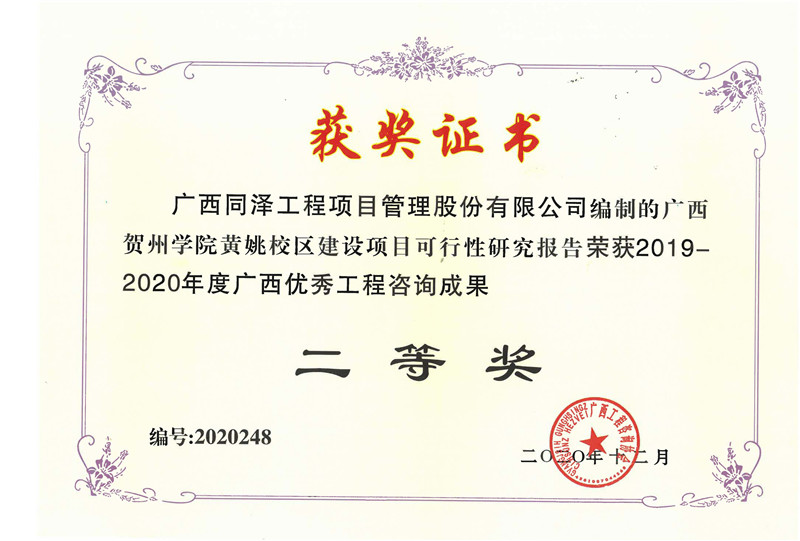 广西贺州学院黄姚校区项目可行性研究报告荣获2019-2020年度广西优秀工程咨询成果二等奖