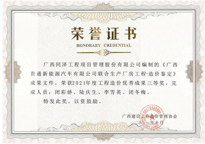《广西贵通新能源汽车厂房造价鉴定项目》荣获2021年度工程造价优秀成果三等奖