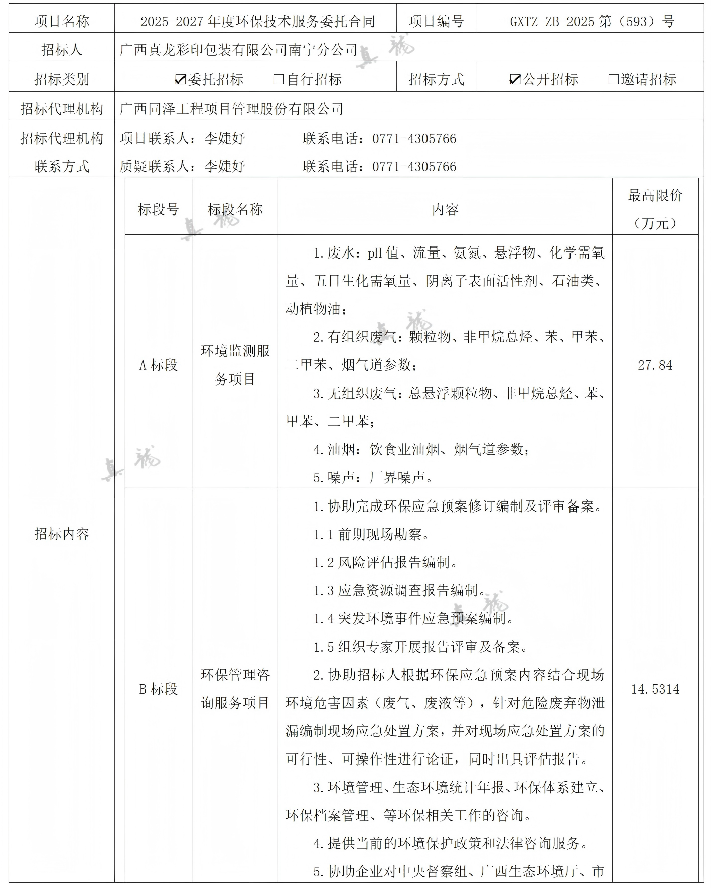 广西真龙彩印包装有限公司南宁分公司2025-2027年度环保技术服务委托合同(项目编号:GXTZ-ZB-2025第(593)号)中标候选人公示