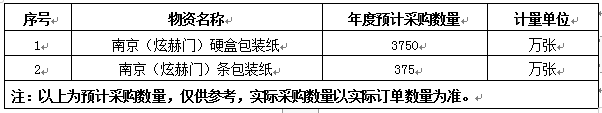 4、南京(炫赫门)硬盒包装纸不含税中标价:1001.7550元/万张,南京(炫赫门)条包装纸不含税中标价:4326.5550元/万张,发票类型:增值税专用发票,发票税率:13%。