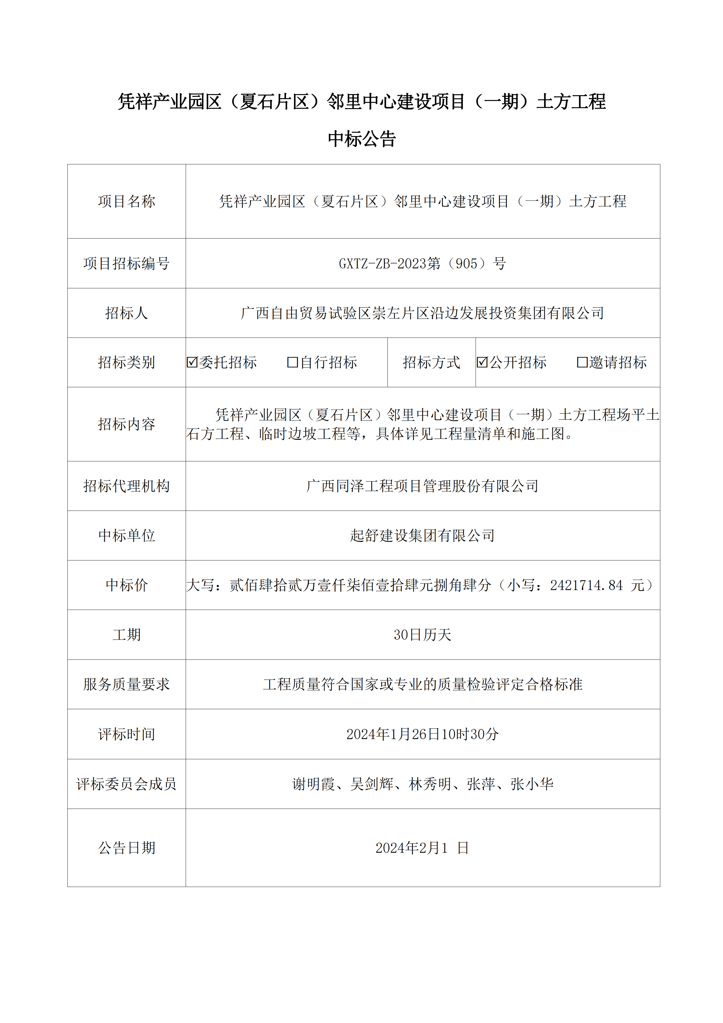 凭祥产业园区(夏石片区)邻里中心建设项目(一期)土方工程中标公告