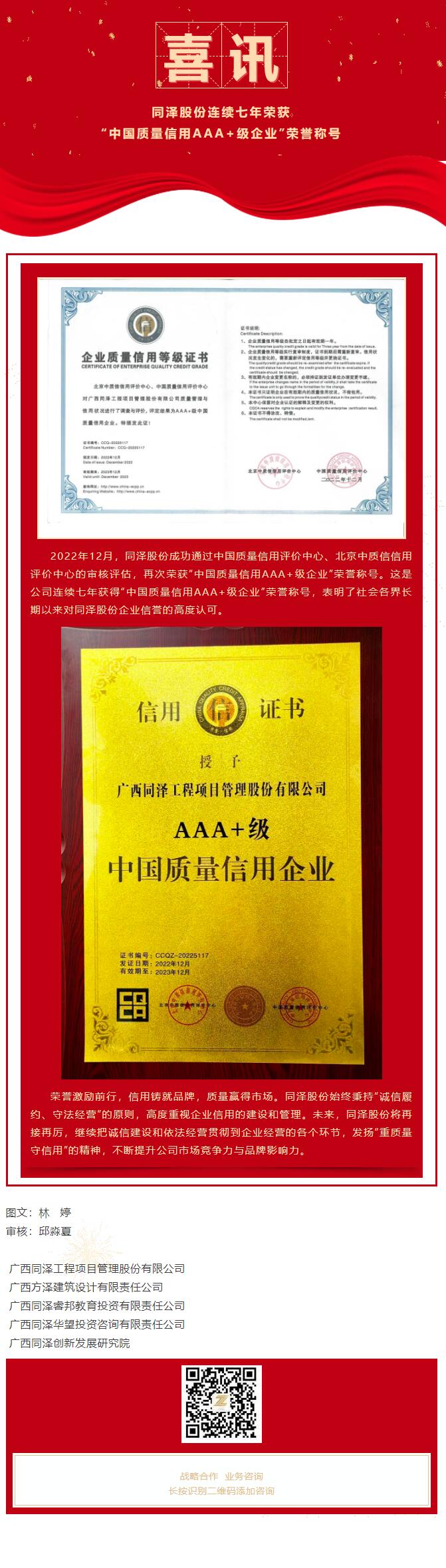 喜讯 | 伟德bv1946官网连续七年荣获“中国质量信用AAA+级企业”荣誉称号
